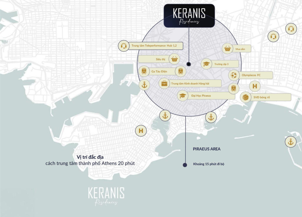 Keranis Residences tọa lạc tại Piraeus – trung tâm cảng biển lớn nhất Hy Lạp và là một trong những khu vực phát triển sôi động nhất thuộc vùng đô thị Athens. Dự án sở hữu vị trí thuận lợi khi nằm gần cảng Piraeus, các tuyến metro, tàu điện và những trục giao thông huyết mạch, giúp cư dân dễ dàng di chuyển đến trung tâm Athens cũng như sân bay quốc tế. Khu vực xung quanh còn tập trung nhiều tiện ích như trường đại học, trung tâm thương mại, văn phòng và dịch vụ. Nhờ lợi thế kết nối toàn diện và hạ tầng đồng bộ, dự án không chỉ thuận tiện cho sinh hoạt hằng ngày mà còn mang lại tiềm năng khai thác cho thuê và gia tăng giá trị lâu dài.